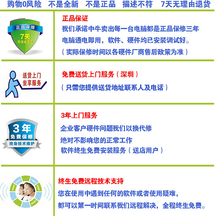 服务承诺:深圳市内免费送货上门,货到安装调试好后再付款,无需预付定金,不管是公司客户还个人客户,我们都会提供正规保修单和收据,公司客户可开17%增值税专用发票和普通发票,支持支票、信用卡、对公转账等;如您需了解更多电脑产品方面的信息,请您与本站客服联系!